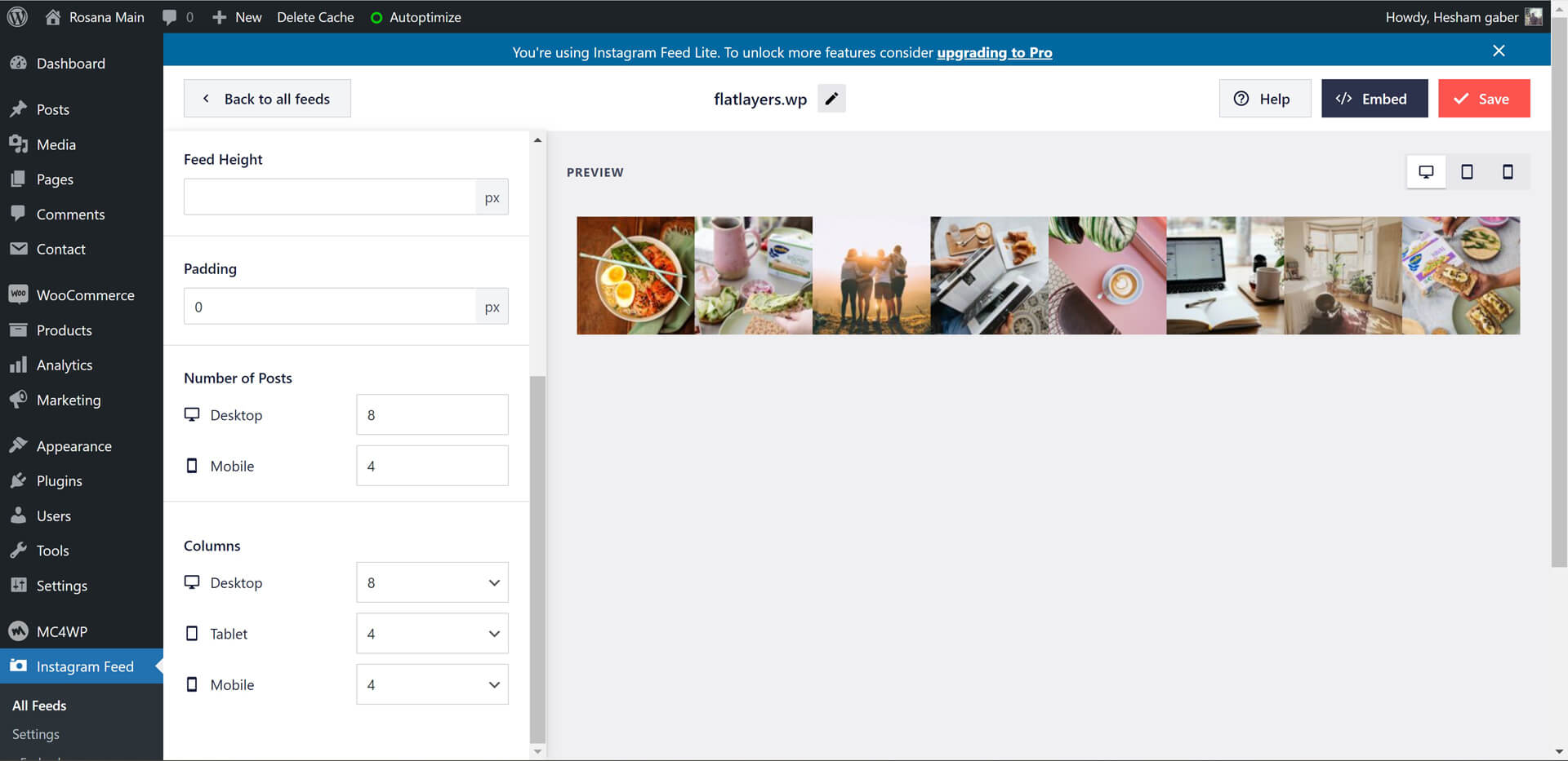 Go to Instagram Feeds > Feed > Feed Layout and set padding to 0, select number of posts and columns for desktop and mobile.