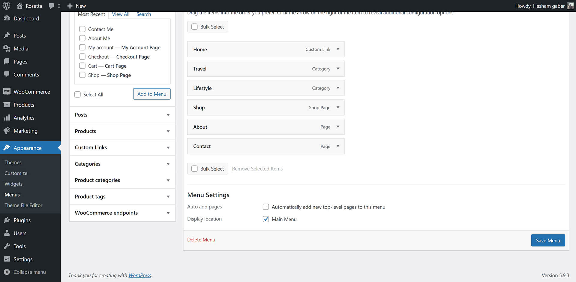Rosetta theme has 1 menu location (Main Menu).